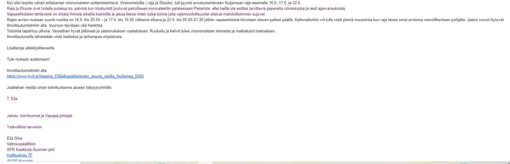 Rajan arvion mukaan suurin ruuhka on 16.6. klo 20.00 – ja 17.6. klo 16.00 välisenä aikana ja 22.6. klo 00.00-21.30 jolloin vapaaehtoisia toivotaan olevan paikan päällä. Kellonaikoihin voi tulla vielä pieniä muutoksia kun raja tekee omat arvionsa menoliikenteen pohjalta. Jaetut vuorot löytyvät ilmoittautumislinkin alta. Vuoroon tarvitaan viisi henkilöä.